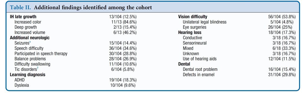 Sonuçlar: Çalışmaya katılan 153 kişiden 104’ü (68%) katıldı ve yaş ortalaması 14 (10-77 yıl arası) olarak belirlendi. Çoğunlukla bebeklik dönemi hemangioması (IH) kalıntıları vardı (%94,1). Katılımcıların yaklaşık yarısı kalan IH için lazer tedavisi aldı ve çoğunluğu (%89,5) görünüşlerinden memnun veya çok memnundu. Nörokognitif belirtiler yaygındı: baş ağrısı/migren (%72,1), öğrenme farklılıkları (%45,1) ve bireyselleştirilmiş eğitim planlarına ihtiyaç duyma (%39,4). Serebrovasküler arteriyopati %91,3 oranında vardı ve bunların %29,4’ünde ilerleme kaydedildi. İskemik inme oranı düşüktü (%1,9). PROMIS global sağlık puanları, normların en az 1 SD altındaydı.