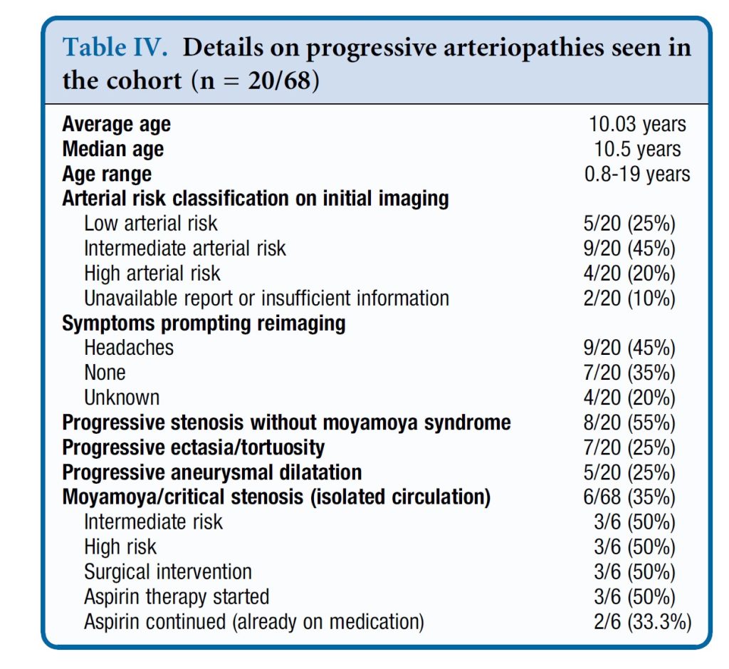 Arteriyel anormallikler %95/104 (%91.3) hastada mevcuttu. Yaşamın yaklaşık 1. yılında görüntüleme raporları %66/104 (%63.5) hasta için mevcuttu ve çocukluk, ergenlik veya yetişkinlik döneminde takip görüntüleme raporları %68/104 (%65.4) hasta için mevcuttu. Nöroradyolog değerlendirmesinde, %19/66 (%28.8) hasta düşük risk, %29/66 (%43.9) hasta orta risk ve %7/66 (%10.6) hasta yüksek risk olarak sınıflandırıldı. %66 hastanın %11’i (%16.7) için risk kategorisini belirlemek için yeterli detay yoktu. Mevcut takip görüntülemesi olan %68 hastanın %20’sinde (%29.4) progresif arteriopati bulguları vardı ve tanı yaşının medyanı 10.5 yıl idi (aralık = 0.8-19 yıl) (Tablo IV). Bu %20 hastanın %5’i (%25) başlangıç görüntülemelerinde “düşük risk” olarak değerlendirilmişti. Kalıcı baş ağrılarının varlığı %9/20 hastada (%45) yeniden görüntülemeyi teşvik ederken, progresif arteriopati %7/20 hastada (%35) rutin tarama sırasında semptomlar olmadan tespit edildi. Kalan %4/20 hastada semptomların varlığı bilinmiyordu. Progresif arteriopati, IH yerleşimi S4 (%4.7 [1.303-16.6] P = .018) ve PF/yapısal beyin anormallikleri (%10.2 [2.5-41.4] P = .0012) ile ilişkilendirildi. Çok değişkenli analizlerde, progresif arteriopatiler ile IH yerleşimi S4 arasındaki ilişki, IH boyutu kontrol edildiğinde (%3.4 [0.831-14.1], P = .089), ek yüz segmenti dahil edilmesi (%4.2 [0.865-20.3], P = .075) ve tanısal özellikler tek tek kontrol edildiğinde (%3.2 [0.703], P = .13) zayıfladı, ancak başlangıç arteriyel risk skorları (düşük, orta veya yüksek) (%9.0 [2.0-40.3], P = .0041) veya bir birey tarafından karşılanan birden fazla tanısal özellik (%3.9 [1.011-14.8], P = .048) tarafından zayıflatılmadı. IH boyutu (%15.9 [3.1-81.3], P = .0009), IH yerleşimi (%8.7 [1.794-42.5], P = .0073), arteriyel risk skoru (%16.3 [2.8-94.2], P = .0018), diğer tanısal özellikler (%14.6 [2.6-82.4], P = .0024) ve bir birey tarafından karşılanan birden fazla tanısal özellik (%7.4 [1.551-35.1], P = .0012) kontrol edildiğinde, PF/yapısal beyin anormalliklerinin varlığı progresif arteriopati ile hala anlamlı şekilde ilişkilendirildi. Propranolol kullanımı bebeklik döneminde progresif arteriopati ile ilişkilendirilmedi (%2.1 [0.653-6.7], P = .21). Alt grup analizinde %68 hastanın %6’sında (%8.8) orta ila şiddetli progresif değişiklikler belirlendi. Beş hastada moyamoya vaskülopatisi kanıtı vardı, birinde ise kollateral dolum olmadan izole dolaşıma yol açan progresif stenooklüzyon vardı. Tüm bu hastalar başlangıç arteriyel risk sınıflamasında orta veya yüksek risk taşıyordu. Şiddetli progresyon, 3 yaşındaki iki çocukta ve 18 yaşındaki bir hastada (muhtemelen önceki görüntüleme eksikliğinden dolayı) belirlendi. İki hasta şiddetli progresyon gelişmeden önce aspirin tedavisi alıyordu ve üç hasta daha moyamoya teşhisi konduktan sonra aspirine başladı. Bir hasta bebeklik döneminde propranolol ile, üç hasta sistemik steroidler ile, bir hasta lazer ile ve diğeri intralezyonel steroid enjeksiyonları ile tedavi edildi. Bu hastalardan hiçbiri akut iskemik inme veya beyin kanaması yaşamadı.